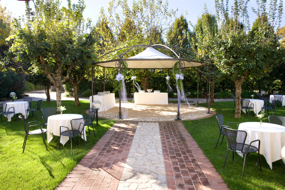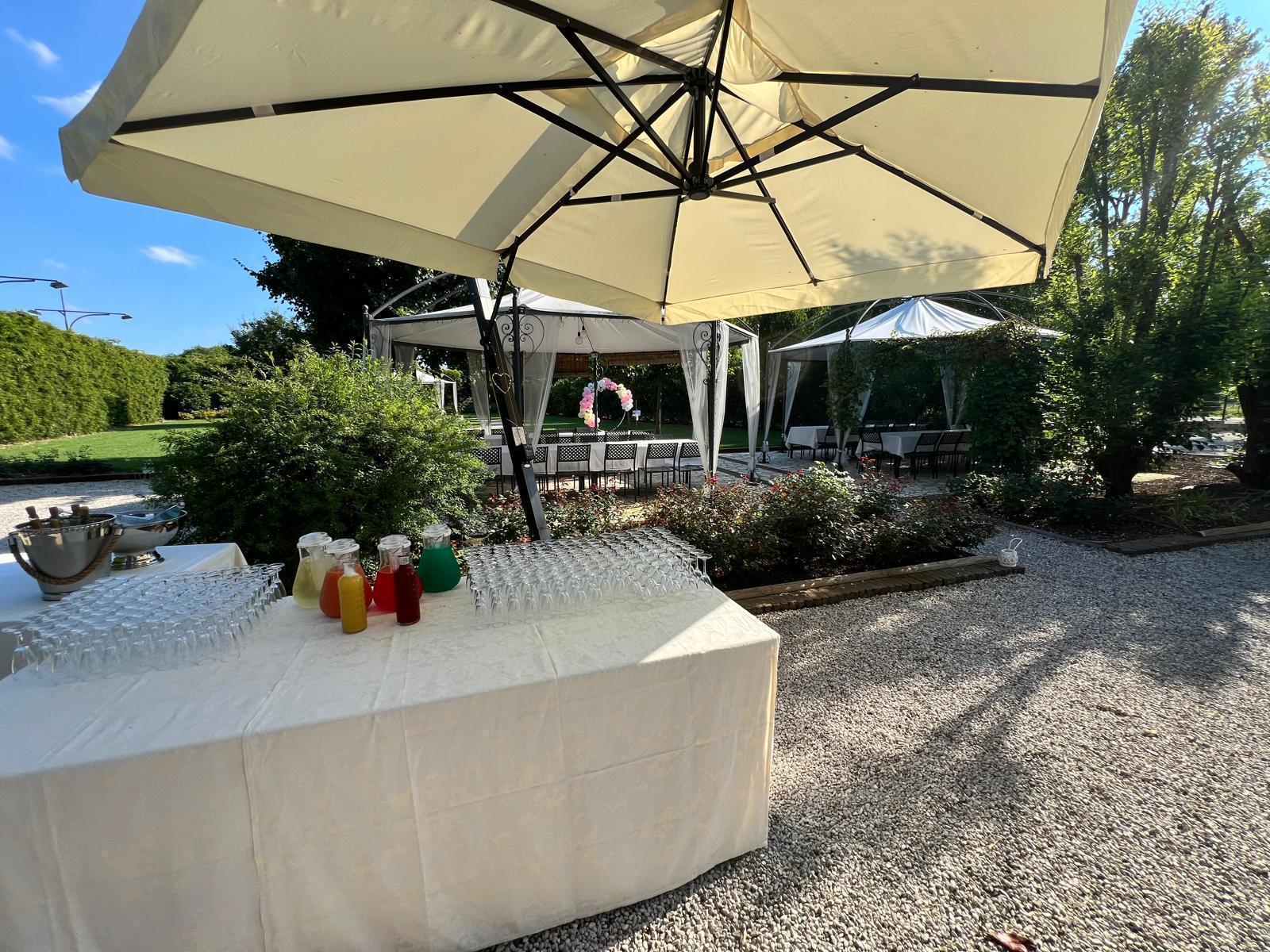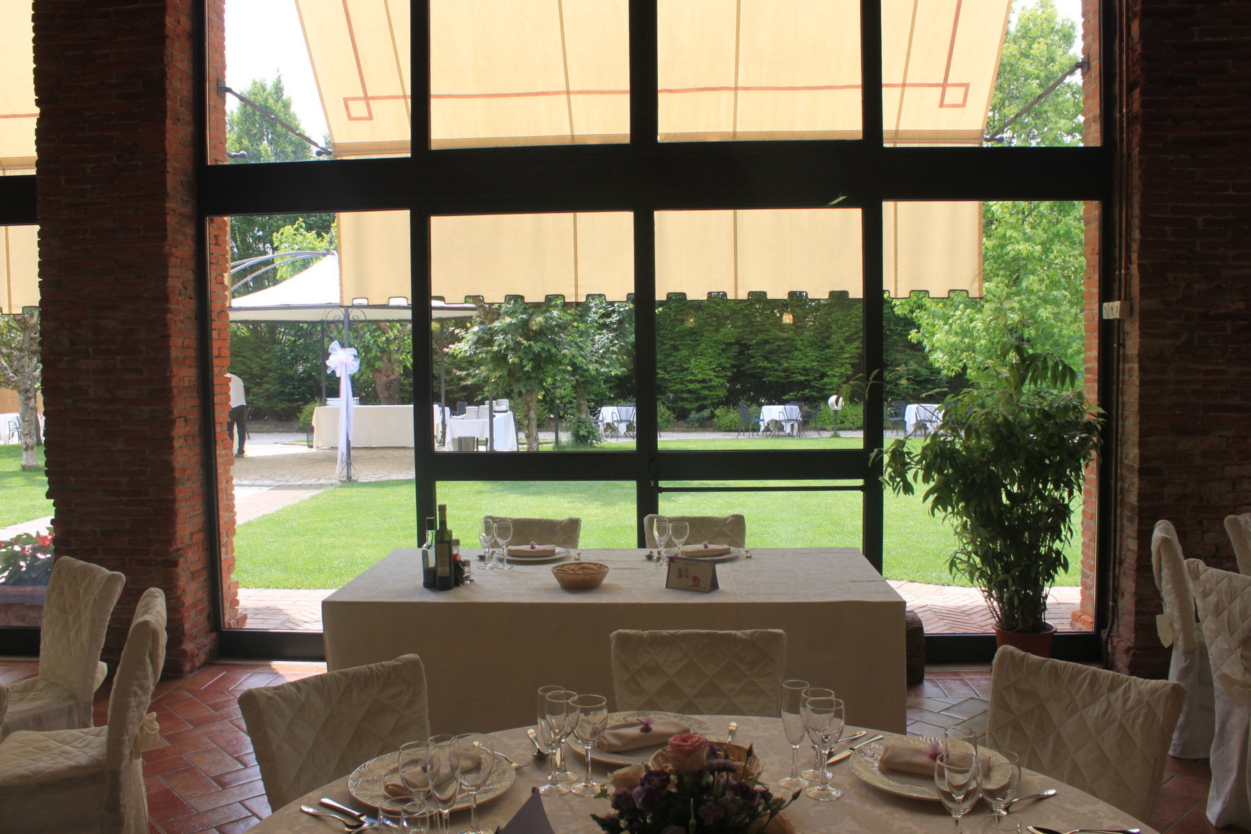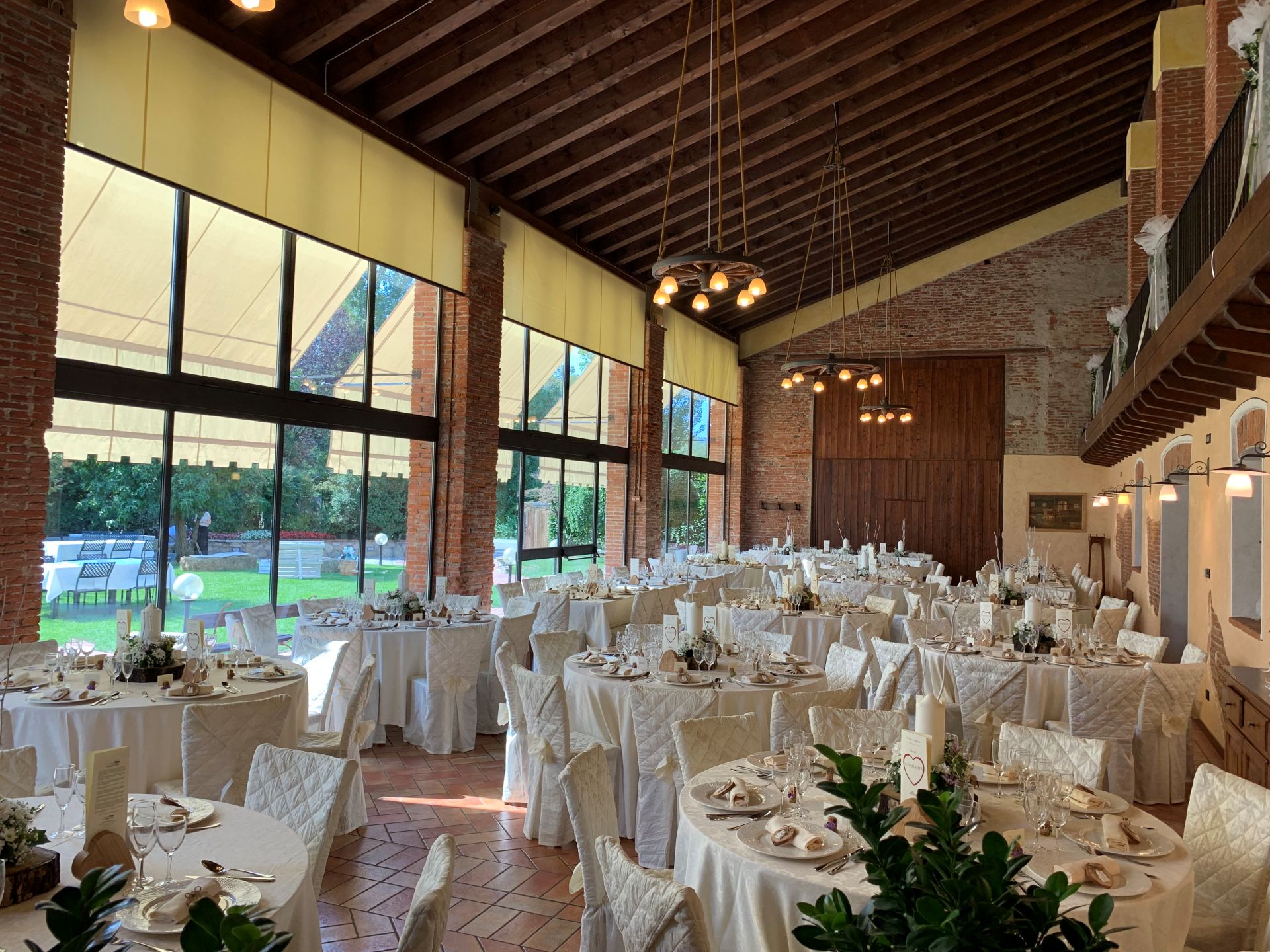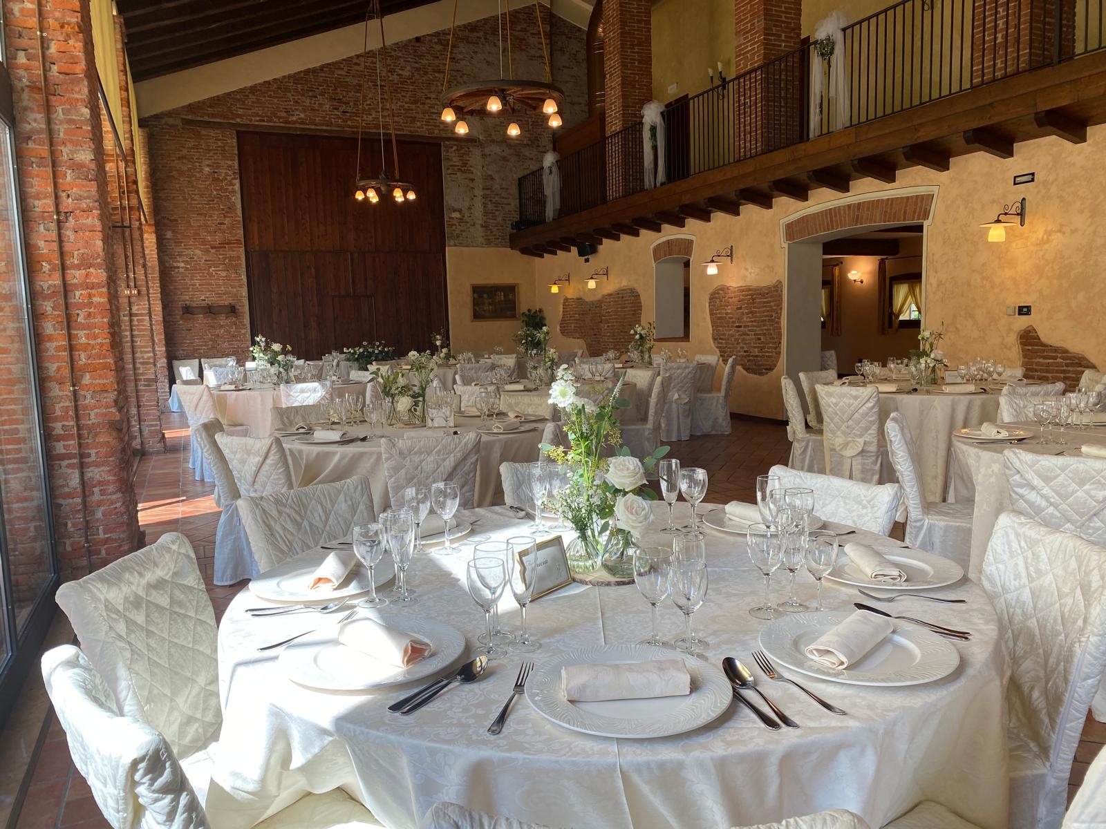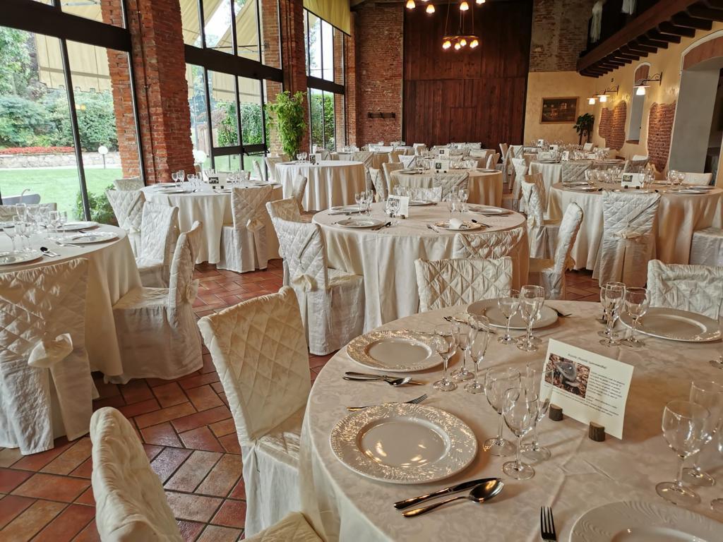 Il banchetto nuziale si svolge all’interno di un grande porticato ristrutturato mantenendo le forme e i materiali originari. Le luminose vetrate consentono agli ospiti di ammirare i colori del giardino e rendono l’ambiente affascinante e suggestivo.